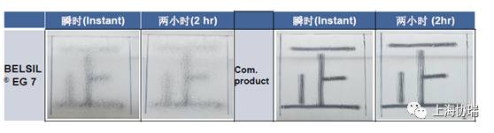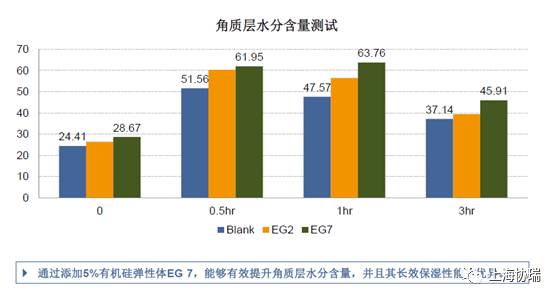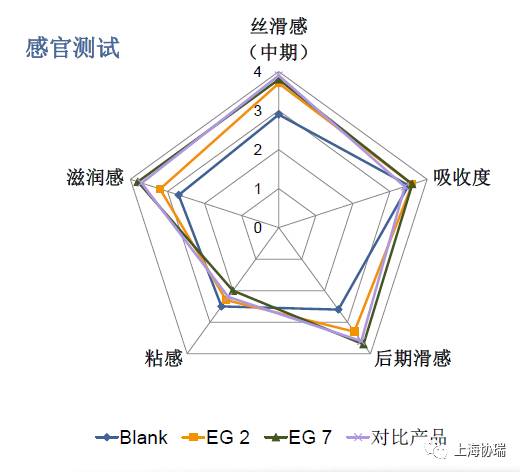 再来看看EG-7的整体感观测试:具有明显的吸收度,丝滑感,滋润感及后期滑感。同时明显降低配方中增稠及保湿剂带来的黏腻感。提升产品的铺展性,抗迁移,填补皱纹,长效防水、保湿,隐形毛孔。